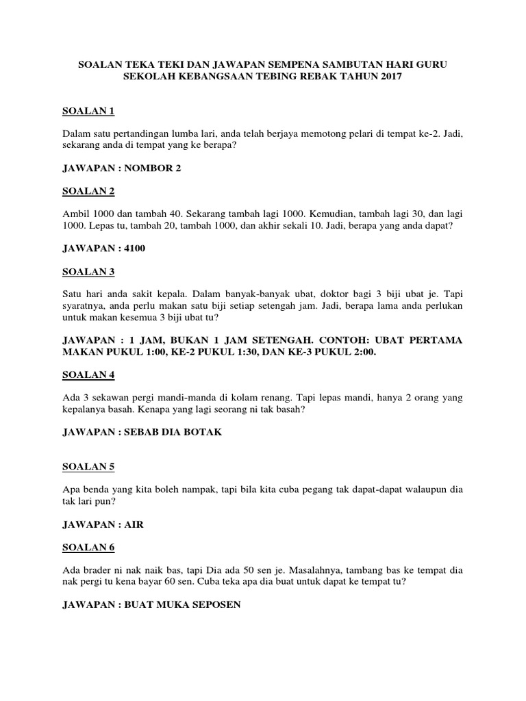 Ilustrasi contoh teka teki mencabar minda dan jawapan yang menarik untuk murid ini dipetik dari laman web berikut : May 19, 2020 · jawapan: Koleksi teka teki lawak, lucu, dan kelakar yang kami sediakan disini pastinya akan mencabar minda yang kreatif anda semua. Untuk pengetahuan anda, itu hanya kulit sahaja dan ada lebih banyak gambar yang editorakan kongsikan dibawah ini. Ia melambangkan kreativiti masyarakat kita dalam berhibur.